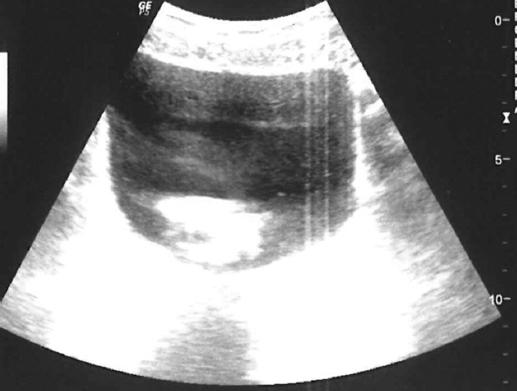 Figure 2 Ultrasonography reporting a stone of 35 mm × 39 mm and emphasizing a strong acoustic shadow.