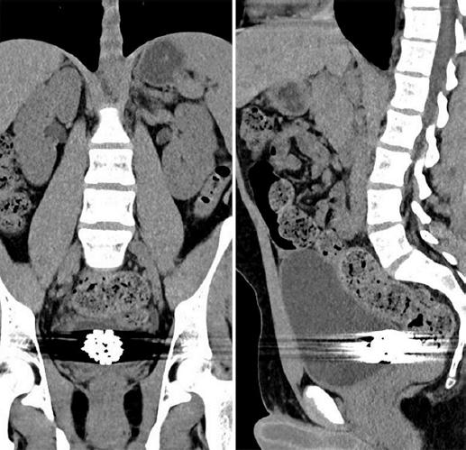 Figure 3 Coronal and sagittal computed tomography sections revealing a 31 mm diameter globe-shaped hyperdense image in the bladder with a marked metallic artifact.