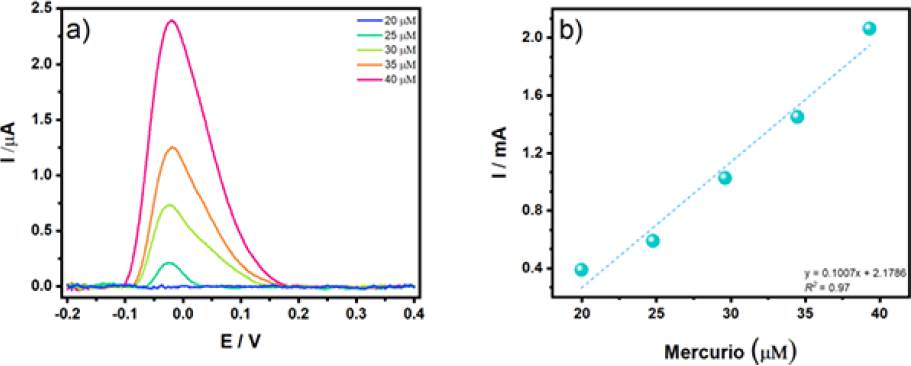 Figura 10 a) Voltamograma de pulso diferencial (DPV) a la respuesta electroquímica de Hg2+ en diferentes concentraciones, y, b) su curva de calibración.