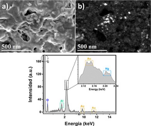 La Figura 11a muestra la micrografía SE-SEM de CNT-SPE/Ox/Au utilizada para la detección de Hg2+. Como se puede observar en la imagen, la superficie está completamente cubierta por la solución y no se aprecian CNT, lo cual indica la saturación del electrodo. La micrografía BSE-SEM de la Figura 11b muestra la presencia de puntos brillantes que están asociados con los metales Au0 y Hg2+. En la muestra, el Hg2+ se ubica uniformemente en el sitio de las NPs-Au, corroborando la alta interacción metalófila entre el Hg y el Au. La Figura 11c muestra el espectro de rayos X de dispersión de energía (EDS) del CNTSPE/Ox/Au con Hg2+, confirmando la presencia de Au0 y Hg2+. Como se informó anteriormente y como se observó en CV y DVP, el Au0 presente en la superficie de las NPs-Au interactúa selectivamente con el Hg2+ y confirma la formación de una amalgama Au-Hg (Thakur, Mandal y Banerjee, 2018).
