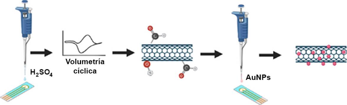 La superficie del electrodo de trabajo serigrafiada CNT-SPE se modificó primero mediante una activación/oxidación electroquímica (CNT-SPE/Ox) mediante voltamperometría cíclica de -1.0 V a +1.0 V a 100 mV/s durante 100 ciclos sobre una gota (50 μM) de ácido sulfúrico (H2SO4, 0.5M). Para agregar las NPs-Au, se realizó una modificación adicional utilizando el método de vaciado por gota (drop casting). Se colocó una gota de 20 microlitros de NPs-Au, con una concentración equivalente de 15 μg/μL (previamente dispersos por sonicación por 5 minutos) en el electrodo de trabajo, luego se protegió para evitar la contaminación por contacto con el aire, hasta secarse por 24 horas. El procedimiento tiene como objetivo generar en primera instancia fracciones hidroxilo, carbonilo y carboxilo los cuales se unen a los compuestos orgánicos que recubren las NPs-Au a través de enlaces de hidrógeno y/o enlaces covalentes. Un esquema del sensor descrito se muestra en la Figura 2.