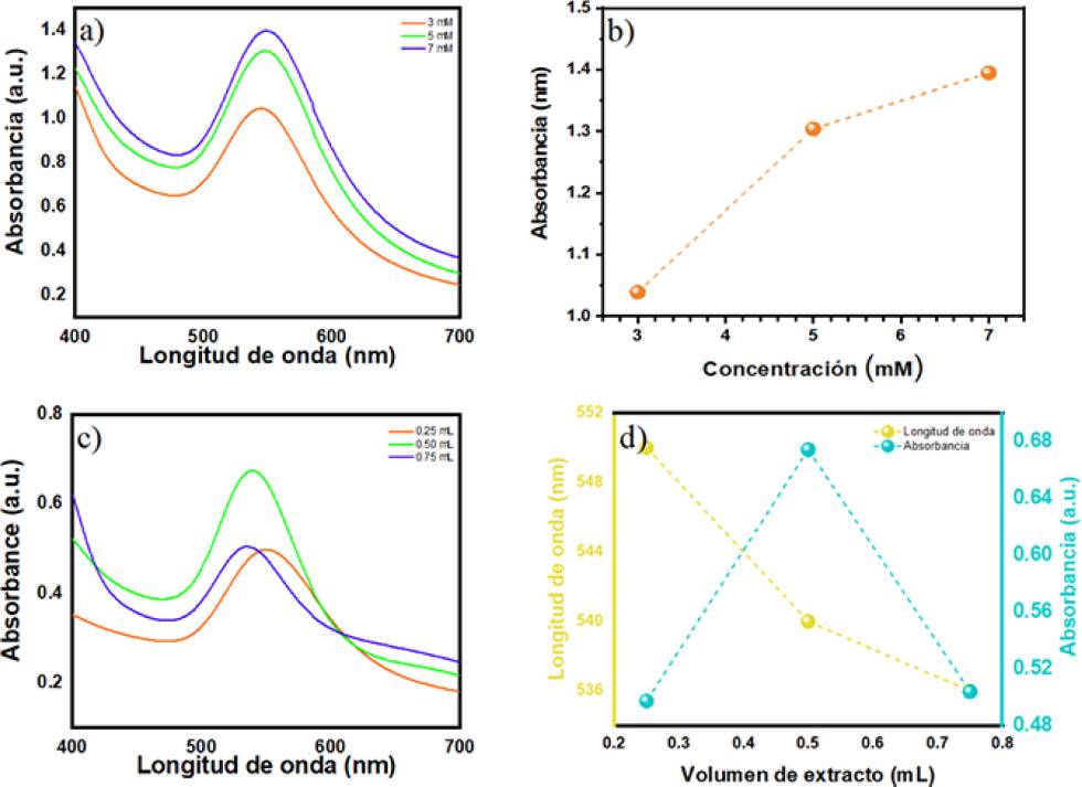 Figura 3 a) Análisis por espectroscopía UV-Vis de las variaciones de la sal precursora y b) el cambio en la absorbancia al variar la sal precursora a una longitud de onda de 554 nm. c) Análisis por espectroscopía UV-Vis de las variaciones de volumen sal : extracto a 7mM y b) cambio en la longitud de onda y absorbancia de acuerdo con las variaciones de volumen sal : extracto.