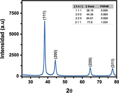 La Figura 4 muestra el patrón de difracción de rayos X de las NPs-Au sintetizadas con extracto de sargazo. El difractograma muestra cuatro reflexiones ubicadas a 38.19º, 44.36º, 64.61º y 77.60º correspondientes a los planos (111), (200), (220) y (311), respectivamente. Estos picos fueron indexados con la tarjeta JCPDF 04-0784 y pertenecen al oro con una estructura cúbica centrada y el parámetro de red estimado fue de 4.07 nm, lo cual, está de acuerdo con los datos de estructura de oro reportados en la literatura. Se usó el diagrama de Williamson-Hall para estimar el tamaño de los cristalitos usando el FWHM de todos los picos de difracción. El tamaño medio de los cristales se estimó en 13.80 ± 1.79 nm. Estos resultados confirman la presencia de oro como única fase cristalina y el papel de los compuestos orgánicos del extracto de sargazo en las nanopartículas sintetizadas.