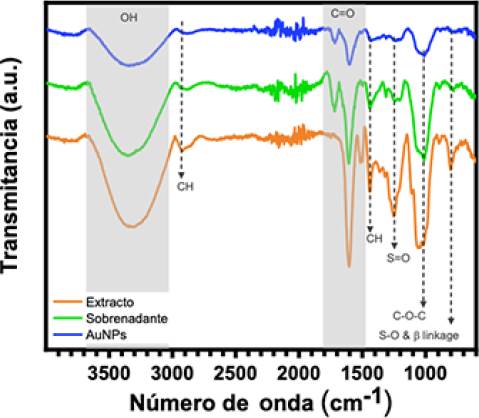 El análisis FT-IR se llevó a cabo para determinar los compuestos orgánicos involucrados en la síntesis de NPs-Au. Los espectros del extracto (línea naranja), el sobrenadante obtenido después del lavado (línea verde) y de las NPsAu sintetizados (línea azul) se muestran en la Figura 5. A pesar de que las 3 señales son muy similares, las bandas muestran un claro cambio en intensidad.