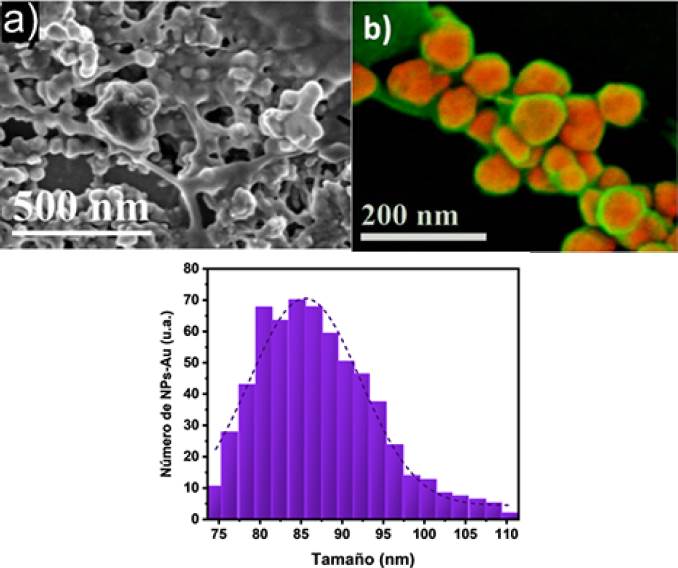 La Figura 6a muestra las micrografías SE-SEM del electrodo serigrafiado comercial de nanotubos de carbono (CNT-SPE) después de ser modificado y funcionalizado con las NPs-Au. La imagen muestra CNT entrelazados, cubiertos por una clase de película y en zonas específicas algunos aglomerados. Dichos aglomerados corresponden a cúmulos de NPs-Au. La Figura 6b muestra una imagen de colores formada por la mezcla de micrografías de electrones secundarios (SE-SEM) y electrones retrodispersados (BSE-SEM) realizadas sobre una muestra de NPs-Au. Es claro dentro de la micrografía que todas las nanopartículas están recubiertas por un compuesto orgánico (color verde) del extracto de sargazo, y las formas poliédricas de las nanopartículas (color rojo) se exhiben con mayor detalle, así como sus rangos de tamaño (entre 80 y 100 nm), como se muestra en el histograma de la Figura 6c.