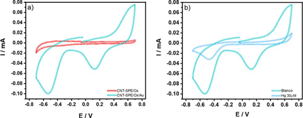 Figura 7 a) Voltamograma cíclico superpuesto a 30 μM de Hg2+ en CNT-SPE/Ox y CNTSPE/Ox/Au; b) voltamograma cíclico superpuesto de 30 μM de Hg2+ y de electrolito (buffer de Sorensen) en CNT-SPE/ Ox/Au.