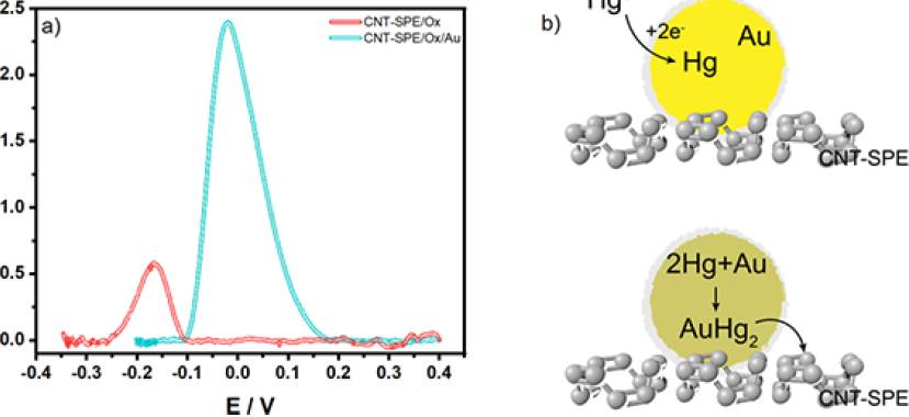 Figura 8 a) Voltamograma de pulso diferencial (DPV) superpuesto a 30 μM de Hg2+ en CNTSPE/Ox y CNT-SPE/Ox/Au, y, b) mecanismo propuesto para la formación de la amalgama.