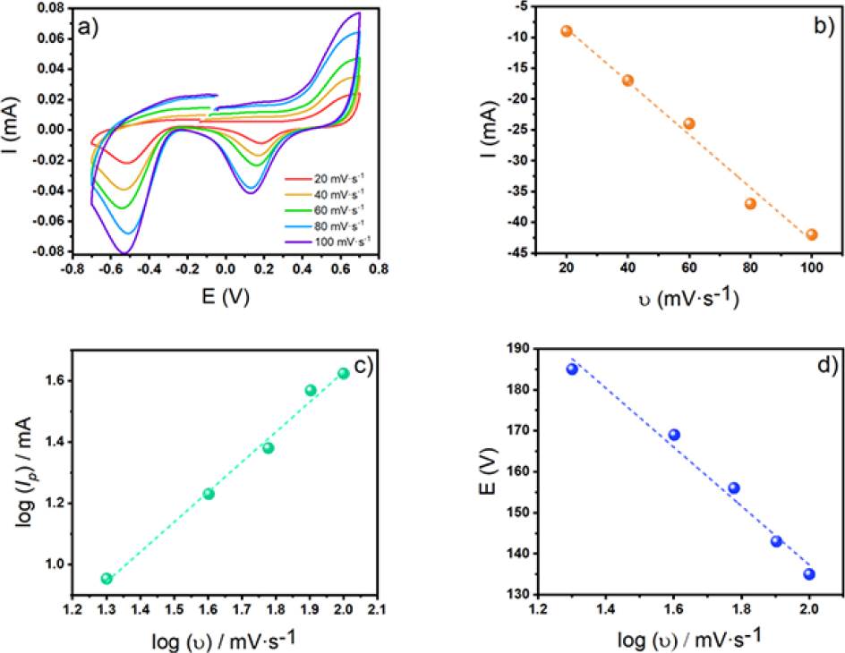 Figura 9 a) Voltamogramas cíclicos de una solución de Hg2+ a 30 μM a diferentes velocidades de barrido; b) gráfica de la corriente máxima de reducción frente a la velocidad de barrido potencial; c) gráfica del logaritmo de la señal potencial de reducción contra el logaritmo de la velocidad de barrido, y, d) potencial del pico anódico frente a logaritmo de la velocidad de barrido.