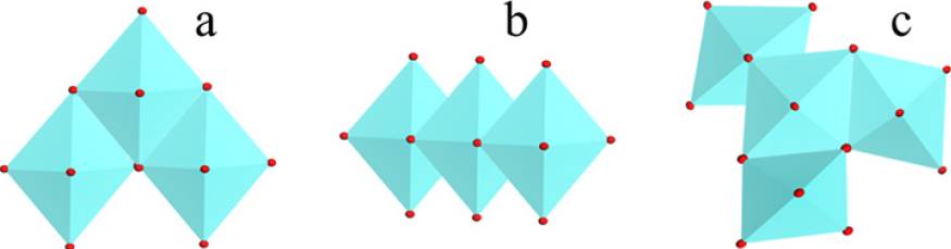 Figura 1 Esquema representativo de octaedros TiO6 formando las fases a) anatasa, b) rutilo, y, c) brookita.
