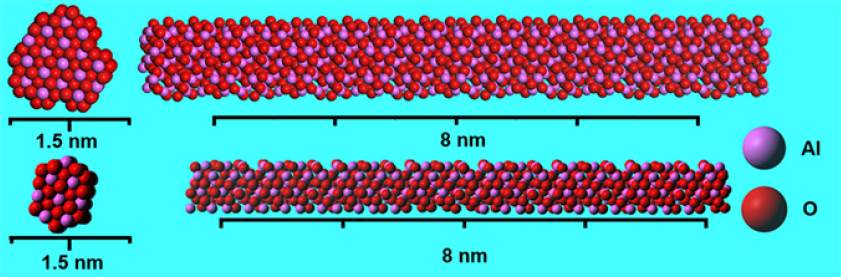 Como se mencionó en el párrafo anterior, la obtención de nanopartículas de alúmina que puedan ser usadas como soporte abre un universo de posibilidades en las que se permita modular, por ejemplo, la interacción metal soporte, o lograr una amplia dispersión de las fases activas. Sin embargo, la síntesis de estos materiales tiene múltiples variables que tomar en cuenta, como el uso de agentes directores de estructura, temperatura, presión, metodología y precursores utilizados. No obstante, la posibilidad de preparar materiales con las características morfológicas deseadas es difícil y no existe un método de síntesis específico para lograrlo. Actualmente, la síntesis asistida por surfactantes es la más usada, debido a que ha demostrado un buen control de la morfología, forma y tamaño con su empleo, aunque las características obtenidas dependen mucho del método utilizado (Kaur et al., 2022). Un caso es la síntesis de alúmina por un método de autoensamblaje, empleando surfactantes como directores de estructura (Yuan et al., 2008). En este caso, se utilizaron distintos surfactantes y precursores de aluminio, lo cual permitió la obtención de materiales con propiedades texturales en función de los precursores y temperaturas de calcinación; áreas superficiales específicas entre 180 m2.g-1 y 480 m2.g-11 y volúmenes de poro de aproximadamente 0.80 cm3.g-1. En general, estos nanomateriales de alúmina presentaron una alta área superficial (> 200 cm3.g-1), con una red mesoporosa ordenada, lo cual es de interés para utilizarse como soporte (Fu et al., 2017) o catalizador. Liu y colaboradores estudiaron el efecto de la morfología de distintas alúminas mesoporosas ordenadas al servir como soporte de paladio en la oxidación catalítica de CO y C3H6, encontrando un aumento en la actividad y estabilidad térmica del catalizador comparado con alúmina comercial no nanométrica (F. Liu et al., 2015). Este material es estable hasta 1000 ºC, presentando una distribución estrecha de tamaño de poro y alta área superficial. Otro ejemplo es el trabajo de Dabbagh y colaboradores, donde reportan la formación de nanobastones de alúmina en presencia de alanina en medio acuoso a condiciones ambientales (Dabbagh et al. 2011). Sus nanobastones tenían diámetros de 6 a 8 nm y longitudes de 17 a 18 nm. Mientras que Díaz de León y colaboradores (Díaz de León et al., 2014) reportaron la síntesis de nanobastones de alúmina empleando surfactantes pluronics y usando 2-propanol como solvente a 0 ºC por 24 horas para formar un gel. Ellos encontraron que la morfología de los nanobastones obtenidos depende de la cadena del surfactante utilizado. La longitud promedio de los nanobastones fue de 26 nm para el pluronic L64 con cadena de 2900 g.mol-1, de 19 nm para el pluronic P123 de 5800 g.mol-1 y de 14.3 nm para el pluronic F68 de 8400 g.mol-1. En cuanto al diámetro de los nanobastones que obtuvieron, estos presentaron un comportamiento inverso, al ser mayor usando el pluronic F68 con 3.2 nm, seguido del P123 con 2.4 nm y de 1.9 nm para el L64. Los resultados de difracción de rayos X mostraron que la fase -Al2O era la que estaba presente en todos los nanomateriales. Usando este resultado realizamos el modelado de las estructuras nanométricas de los nanobastones dependiendo de su diámetro y longitud. Como se puede observar en la Figura 3, los nanobastones tienen el mismo arreglo cristalino y solo cambia la cantidad de átomos presentes en cada estructura. Para el caso de los nanobastones de Dabbagh y colaboradores (Dabbagh et al., 2011), se utilizaron 575 átomos totales, de los cuales 348 fueron oxígenos. Para el caso de los nanobastones más grandes de Díaz de León y colaboradores (2014), se usaron 1,454 átomos, de los cuales 912 fueron oxígenos (Figura.3).