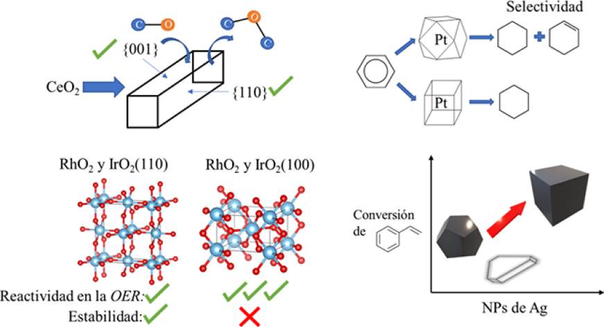 Figura 5 Esquemas con relación de la estructura y reactividad catalítica de algunos trabajos mencionados: a) oxidación de CO sobre nanovarillas de CeO2; b) selectividad atribuida a la estructura de nanoestructuras de Pt durante la hidrogenación de benceno; c) reactividad en distintos planos durante la OER de RhO2 y IrO2, y, d) conversión de estireno en distintas nanoestructuras de Ag.
