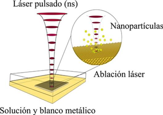 Figura 6 Representación esquemática de la obtención de nanopartículas a partir de un láser pulsado de nanosegundos.