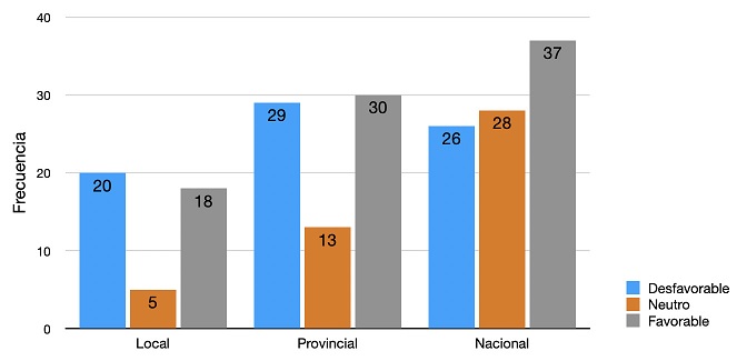 Con respecto al alcance geográfico de los medios y la valoración, se observó el mismo patrón tanto en diarios locales como provinciales respecto a la proporción de titulares favorables y desfavorables. En cambio, en los medios nacionales los titulares favorables fueron mayores (véase Figura 1).