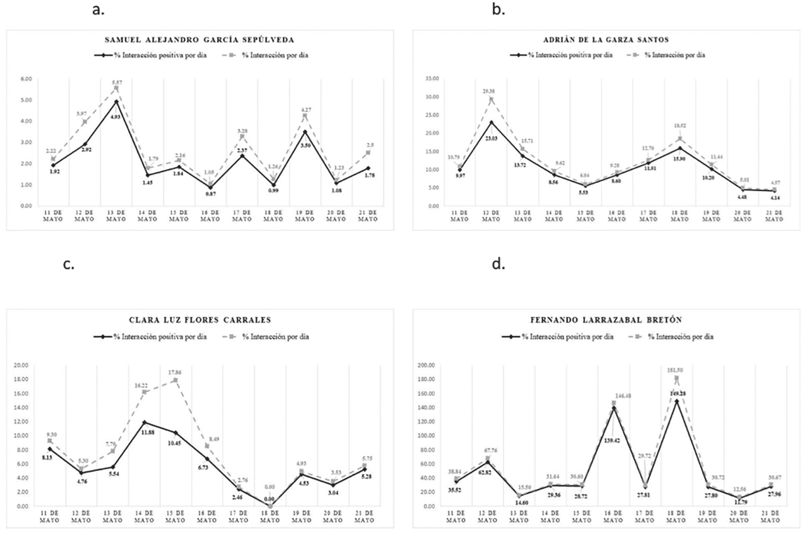 Figura 2 Interacción positiva e interacción por día en las cuentas de Twitter: @samuel_garcias, @AdrianDeLaGarza, @claraluzflores1 y @FerLarrazabalNL.