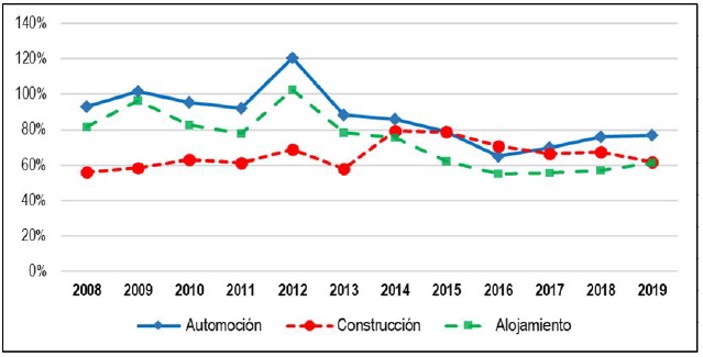 Dado el peso relativo de las rentas del trabajo en la distribución de las rentas generadas, parece oportuno realizar una comparativa en los tres sectores, observándose en la Figura 7 cómo en el año 2012 se produce la mayor participación de los trabajadores, tanto en el sector de la automoción como en el del alojamiento, al absorber incluso más del 100% de las rentas generadas. Sin embargo, a partir de 2013 se produce una disminución paulatina, que se irá traduciendo en una convergencia de los tres sectores.