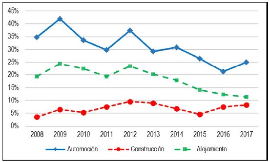 Un último apunte cabe hacer en torno a la importancia relativa de la amortización con respecto a las rentas generadas, reflejada en la Figura 9. Como era de esperar, el sector de automoción se caracteriza por el mayor peso de esta partida, seguido del alojamiento hotelero y por último de la construcción, con una tendencia decreciente en los dos primeros casos y una leve alza en el tercero.