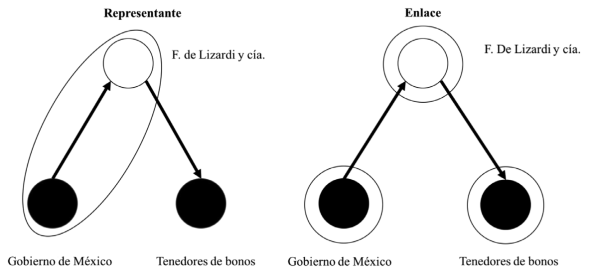 Por su parte, F. de Lizardi y Compañía comprendió desde el inicio que el hecho de haber nacido en Veracruz y tener negocios en México era un activo importante para hacerse cargo de la agencia financiera. Lizardi también apeló a ese discurso a conveniencia; sin embargo, cuando tenía que apretar al gobierno mexicano y sus representantes en Londres, el interés particular prevalecía por encima de cualquier sentido de identidad. Al final de cuentas, siguiendo a Salvucci y Salvucci, los hermanos Lizardi “podían ser patriotas en el momento fluido y cambiante de la época, pero ante todo eran banqueros”.74 Por tanto, en el esquema de intermediación propuesto, los Lizardi no actuaron en este proceso como “representantes” del gobierno mexicano, sino más bien como “enlace”. Es decir, como un intermediario cuya filiación es externa, por lo que coordina el intercambio de intereses entre dos grupos distintos, en este caso el gobierno mexicano y los tenedores de bonos.