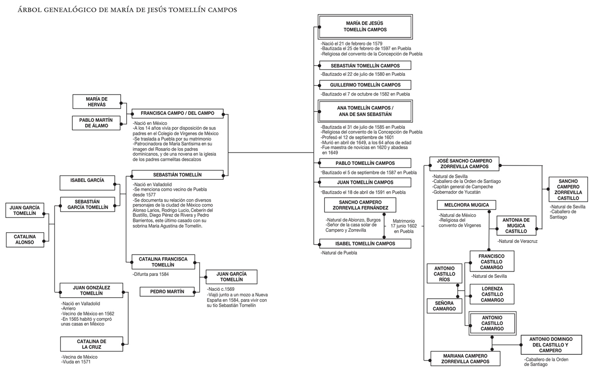 María de Jesús era criolla hija de un español y una criolla, María Campos. Su madre y toda su descendencia ya habían nacido en América. Vivió su infancia en Puebla de los Ángeles junto con sus otros seis hermanos, cuatro varones y dos mujeres más. Para María, por ser la hija mayor, el padre tenía apalabrado un redituable matrimonio, mismo que se frustró por el interés de la joven en hacerse monja concepcionista.26 Además de María, Ana, su hermana menor, también fue religiosa en el recién fundado convento de la Limpia Concepción.27 En el ámbito familiar únicamente se logró consolidar el desposorio de su hermana Isabel con Sancho Campero Zorrevilla Fernández, el 17 de junio de 1602. Él era natural de Abionzo, en el Valle de Carriedo en Burgos, reconociéndose como Señor de la casa solar de Campero y Zorrevilla. Este matrimonio llevo a la criolla Isabel Tomellín Campos a Sevilla, donde procreó a Mariana y José Sancho Campero Zorrevilla Campos. Este último llegó a ser caballero de la Orden de Santiago y, al igual que su abuelo materno, también viajo a Nueva España; en Campeche fue capitán general y gobernador de Yucatán. Contrajo nupcias con Antonia Múgica Castillo Camargo, criolla originaria de Veracruz.28 Uno de los hijos de esta rama familiar es el que llama nuestra atención, don Antonio Castillo Camargo, que fue el financiante de la primera “Vida” de María de Jesús, su tía abuela.