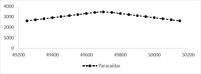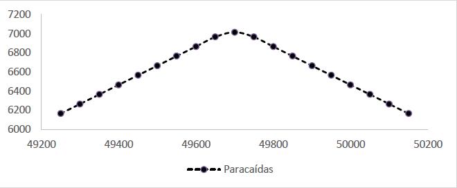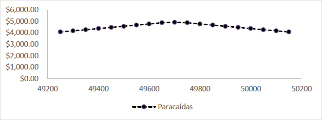 En el Cuadro 7, se muestran las ganancias o pérdidas esperadas por estrategia de opciones financieras, donde se resalta la pérdida de 1.0848 mediante la estrategia mariposa, mientras que la estrategia paracaídas se observa ganancia de 6 688.9041, pues se tiene un valor pronosticado de 49 887.5125 puntos base para el S&P BMV/IPC, lo que representaría una caída en el índice respecto al mes anterior. La expresión gráfica de la mejor estrategia se puede apreciar en la Gráfica 10.