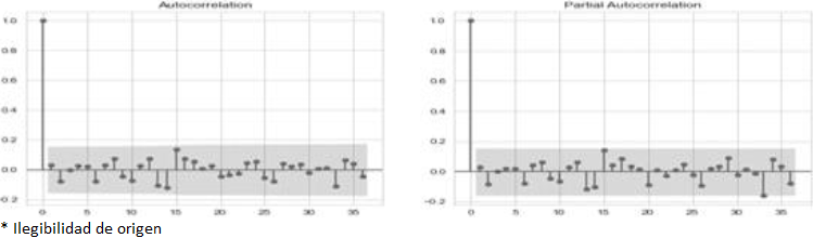 Estando conformada por la ACF y PACF. La ACF representa el retardo de los coeficientes de autocorrelación, esta función se caracteriza porque ρk decrece rápidamente lo que indica que la serie de tiempo puede ser estacionaria. Mientras que la PACF ayuda a identificar la magnitud de desfase en un modelo autorregresivo (AR), ayudando a reconocer los rezagos adecuados de orden p y poder modelar un AR. Además de medir la relación entre yt y yt-k cuando se elimina el efecto de yt-1,yt-2,,yt-k+1 por lo que el número de coeficientes distintos de cero, indica el orden del proceso autorregresivo.