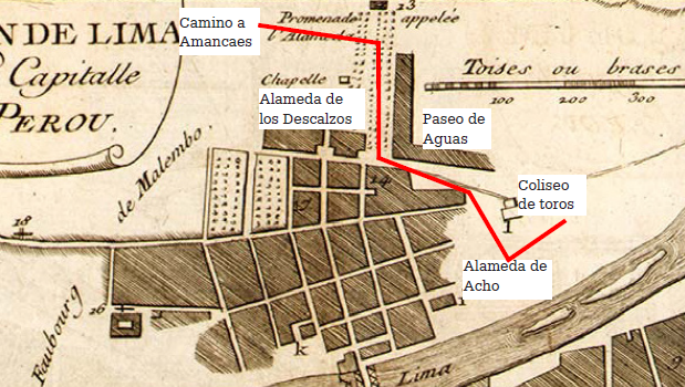 Cerca de la Alameda de los Descalzos estaba la plaza de toros de Acho, que fue edificada en 1765 por Agustín Hipólito de Landaburu, a través de un contrato con el superior gobierno al mando del virrey Amat, donde fue obligado a asumir los gastos de la obra además de costear tres pilas para la antigua Alameda de los Descalzos. Esta plaza de toros y su Alameda de Acho, remozada en 1773, tenía tres calles: la del medio destinada a caballos y carruajes, y los laterales para los individuos de a pie (Bromley, 2019, p. 85). Su extensión era de 25 varas de ancho y 316 de largo, desde la entrada hasta la plazoleta del Acho. En los alrededores de la Alameda de Acho se estaban urbanizando o construyendo casas, pero los vecinos no respetaban la línea de la calle, y la ocupaban, presentándose litigios.
