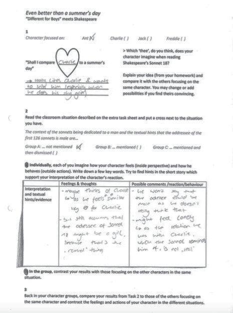 This last part of the empirical investigation collects several vignettes from the teaching unit in which students take over the perspective of one of the protagonists of Different for Boys, and juxtapose the individual perspectives with several classroom scenarios in which the reading of Shakespeare’s Sonnet 18 is handled in heteronormative, inclusive or homophobic ways. These vignettes explore how far the students developed empathy and managed to take over or change into, the perspective of their chosen protagonist - and what insights into the effects of norms of gender and sexuality were gained by this. The data for these vignettes are taken from the students’ hand-written notes on the worksheets (see Figure 1 for an example).