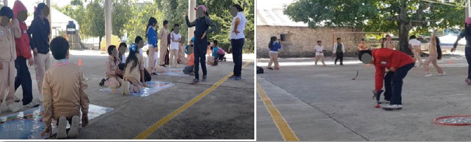 El alumnado escribió en las hojas palabras como “juego”, “diversión”, “escuela”, “no sé”; la mayoría no formuló una oración o idea completa. La docente desarrolló su clase utilizando juegos autóctonos. En la organización de los equipos se utilizaron dinámicas para hacerlos, si bien no se organiza por niños y niñas, las niñas quedan agrupadas en equipos mientras que los niños en otros, como se observa en la imagen izquierda de la Figura 3.