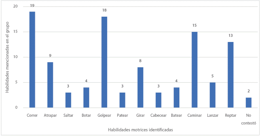 Por último, como actividad de evaluación final, la docente proporcionó una hoja al alumnado para describir los aprendizajes que consideraron haber adquirido sobre las habilidades motrices. En la Figura 4, se expresan las habilidades identificadas por el alumnado, que la docente retroalimentó con la pregunta detonadora “¿en qué otras actividades de la vida cotidiana las usamos?”. Posteriormente, invitó al grupo a participar, pero el tiempo no permitió que todos lo hicieran de forma oral, la participación de miembros del grupo se igualó a través de la participación en forma escrita con las actividades propuestas.