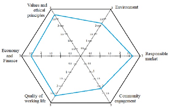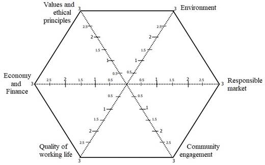 Likert scales with numerical ratings facilitated the measurement and interpretation of data. For example, YES (Always): 3; Sometimes: 2; No (Never): 1; with options of Not applicable or No answer. The averages obtained in each area should be transferred to the axes of the Hexagon (marked with a dot) to visualize the result individually. The figure resulting from joining the points already marked is intended to illustrate the overall situation of the company in terms of CSR: the closer the figure obtained is to the Hexagon, the greater the development of the company's CSR" (Universidad del Externado - CSR tools) (Figure 2).