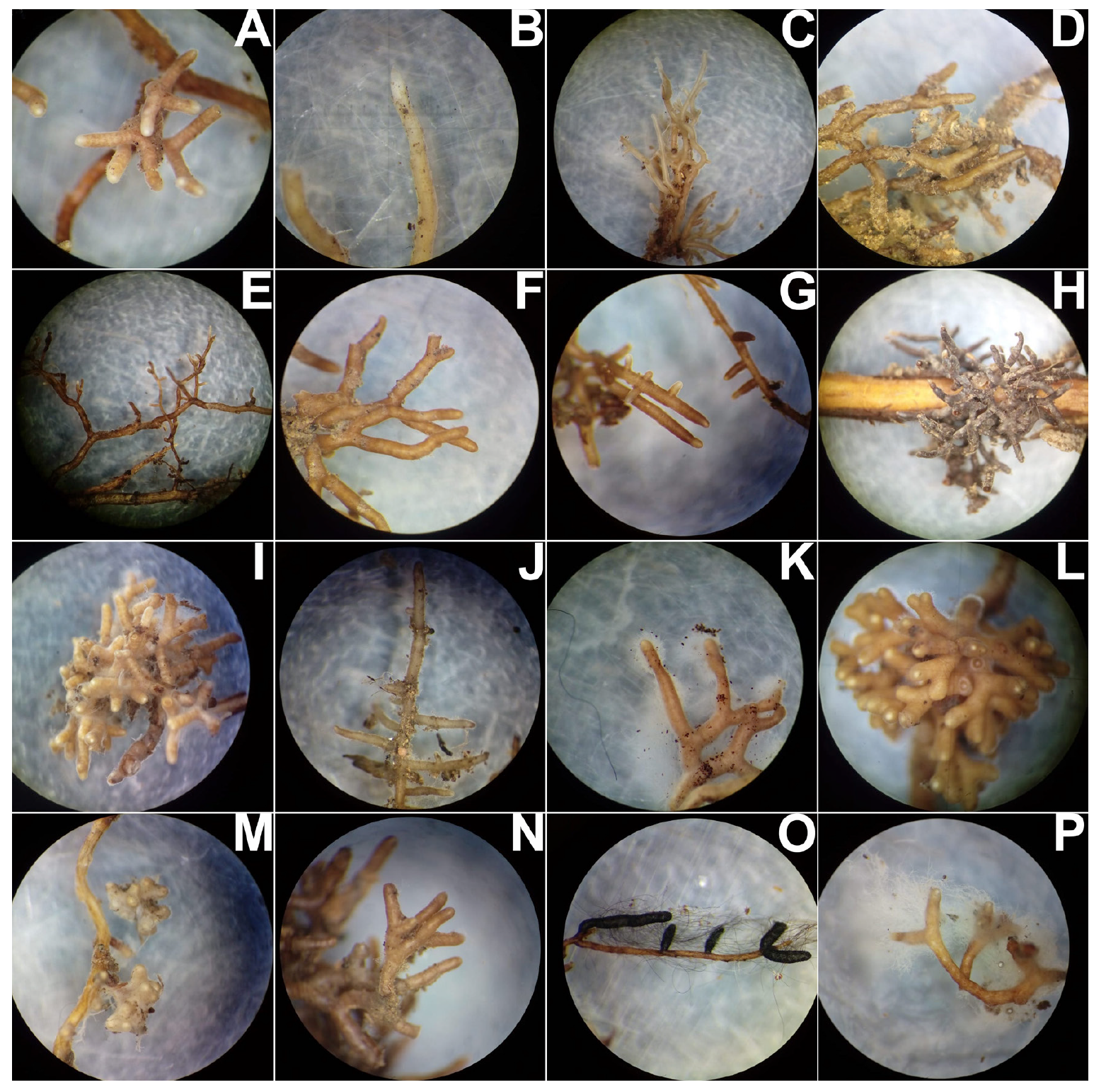 Figura 1 Morfotipos de las raíces ectomicorrízicas de Pinus patula y Quercus crassifolia correspondiendo a 14 “Species Hypothesis” (SH) en UNITE (Tabla 2). A: M1, Thelephora terrestris con P. patula. B: M2, Tomentella radiosa con P. patula y C: con Q. crassifolia. D: M3, Thelephoraceae con P. patula. E: M4, Thelephoraceae con Q. crassifolia. F: M5, Lactarius con P. patula y G: con Q. crassifolia. H: M6, Piloderma sphaerosporum con P. patula. I: M7, Laccaria sect. laccata con P. patula. J: M8, Laccaria sect. amethystina con Q. crassifolia. K: M9, Laccaria con P. patula. L: M10, Tuber cf. separans con P. patula. M: M11, Rhizopogon succosus con P. patula. N: M12, Inocybe con P. patula. O: M13, Cenococcum geophilum con Q. crassifolia. P: M14, Tylospora con P. patula.