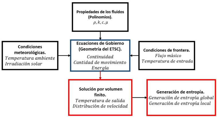 El modelo numérico del ETSC requiere de la representación matemática de los fenómenos físicos involucrados a través de las ecuaciones de conservación de masa, cantidad de movimiento y energía [30,31].