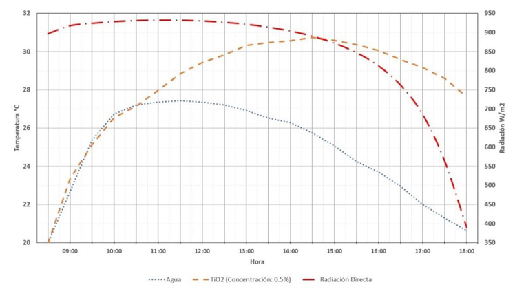Esto se debe a que el calor específico del nanofluido es menor en comparación con el del agua, por lo que se requiere menor energía para incrementar su temperatura. Es decir, incluso con menor radiación solar, el nanofluido seguirá aumentando su temperatura.