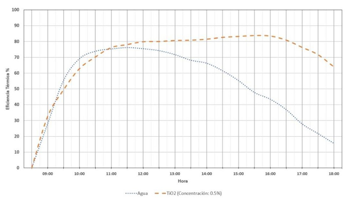 En general, utilizar nanofluido de TiO2 de base agua aumenta la eficiencia térmica del colector solar en comparación con usar simplemente agua, teniendo una eficiencia máxima de 82.5% al usar el nanofluido en comparación con el 61.5% del agua.