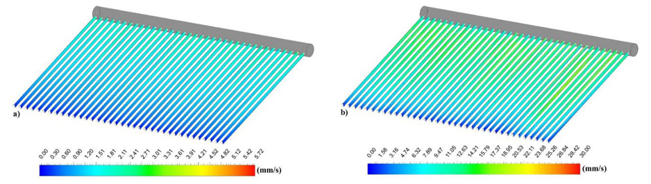 Por otro lado, la figura 6 muestra el comportamiento hidráulico dentro de los tubos del ETSC al utilizar agua (figura 6a) y al utilizar el nanofluido de TiO2 de base agua (figura 6b), ambas a las 14:30 horas. Se observa que, al utilizar agua, se obtiene una velocidad máxima de 5.72 mm/s localizada en la unión del cabezal y los tubos evacuados, mientras que al usar el nanofluido, se obtiene una velocidad máxima de 30 mm/s en la misma zona. En promedio, se obtiene una velocidad dentro de los tubos evacuados de 0.38 mm/s y de 10.72 mm/s al utilizar agua y nanofluido respectivamente. En general, para todo el tiempo de operación, el uso del nanofluido conlleva a una aceleración en el fluido dentro del colector solar debido a la disminución de la viscosidad. Así mismo, dicha aceleración conlleva a una uniformidad en la temperatura dentro del ETSC, y, por tanto, una disminución en la generación de entropía por transferencia de calor al utilizar el nanofluido (lo cual se observará en la sección 4.2 y 4.3). Sin embargo, es importante resaltar que los valores de las velocidades son muy bajos para ambos fluidos de trabajo, esto tendrá como consecuencia una muy baja generación de entropía por efectos viscosos.