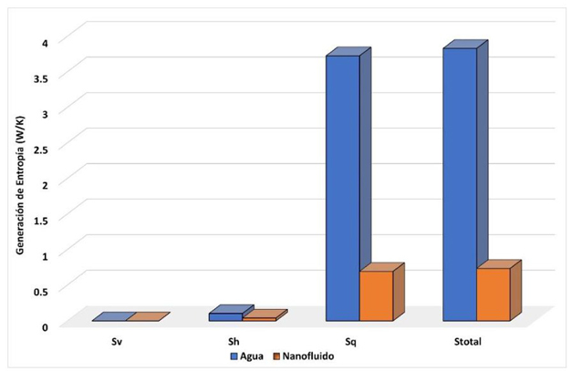 Finalmente, en la generación de entropía por pérdida de calor, S q , se obtuvieron valores máximos de 3.72 W/K y 0.69 W/K al utilizar agua y nanofluido respectivamente, lo cual llega a representar una disminución del 81.32%. La generación de entropía por pérdida de calor representa el 94.27% y 97.27% del total de la generación de entropía para el agua y el nanofluido respectivamente. Estos resultados se deben a los cambios en las propiedades del nanofluido, especialmente en el calor específico.