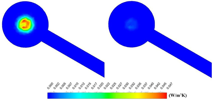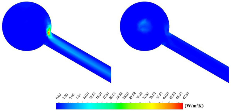 La figura 8 muestra una comparación de la generación de entropía local debido a efectos viscosos al utilizar agua (izquierda) y nanofluido de TiO2 de base agua (derecha) como fluido de trabajo. El contorno se muestra en un plano vertical en el primer tubo evacuado del ETSC a las 14:30 horas.