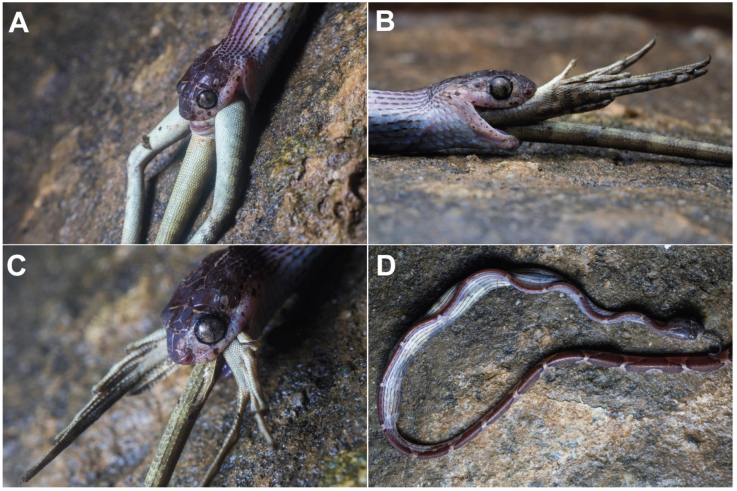 Figure 1 Sequence of the predation event of Imantodes cenchoa preying on a juvenile Basiliscus galeritus at the San Cipriano Forest Reserve, Colombia. A. Swallowing the prey by the head, B.C. Lateral and frontal view of prey´s body already almost completely swallowed, D. I. cenchoa ends up swallowing its prey. / Figura 1. Secuencia un evento en que Imantodes cenchoa depreda a un juvenil de Basiliscus galeritus en la Reserva Forestal San Cipriano, Colombia. A. ingiriendo la presa por la cabeza, B.C. Vista lateral y frontal del cuerpo de la presa ya casi ingerida, D. I. cenchoa termina de ingerir a su presa.