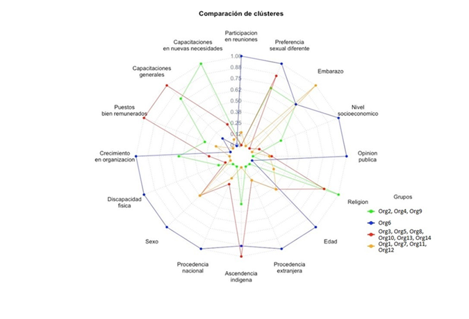 La información obtenida a través de MaxQDA y RStudio arrojó la conformación de cuatro grupos desarrollados a partir de los criterios de no discriminación laboral, en donde el elemento analizado fue el de “embarazo”. Se determinó que los valores que van de 0.10 a 0.34, tienen un grado bajo en el cumplimiento de la no discriminación laboral, mientras que para los valores que oscilan entre 0.35 a 0.74 un grado medio, y para los que entran en el rango de 0.75 a 1.00, un grado alto.