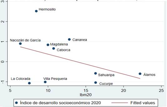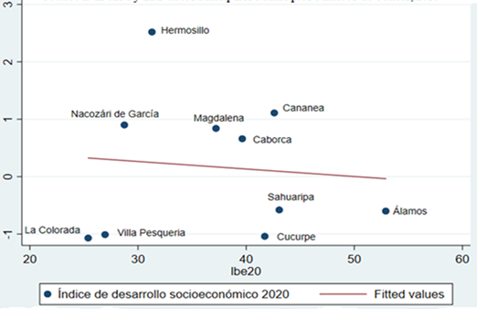 También se encontró que existe una relación inversa o negativa entre el IDSEM, el IBE y el IBM. En otros términos, a medida que se incrementa el IDSEM aumenta también el bienestar de la población en los municipios (son menos las personas que no tienen ingreso para alcanzar el bienestar económico y/o adquirir la canasta alimentaria) y, viceversa. Los municipios de Hermosillo, Nacozari de García, Sahuaripa y Álamos son un claro ejemplo de esto.