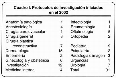 A partir de 2001 la Dirección de Investigación se organizó en las siguientes áreas: Investigación Clínica, Diseño y Análisis de Investigaciones, Biología Molecular e Histocompatibilidad, Epidemiología, Ecología de Agentes Patógenos, Cirugía Experimental y Bioterio, promoviendo la realización de protocolos de interés particular del personal de la Dirección de Investigación y la colaboración y el apoyo a las áreas clínicas del hospital. La Subdirección de Investigación Biomédica, a cargo del doctor Simón Kawa Karasik, supervisa el registro y seguimiento de todos los protocolos del hospital y de sus productos. En el cuadro I se muestra la distribución de los 91 protocolos de investigación que se iniciaron en 2002 según el área responsable. También apoya la realización de proyectos de investigación con la industria farmacéutica, con el propósito de asegurar la integridad tanto de los sujetos que participan en estas investigaciones, como para proteger los intereses del hospital.