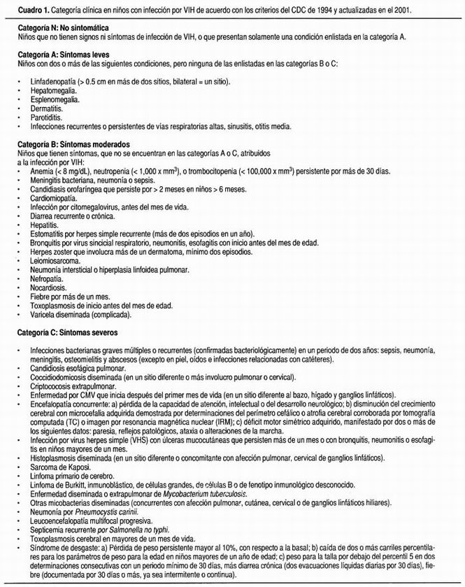 Desde 1994 el Centro para el Control de Enfermedades de Atlanta estableció un sistema de estadificación clínico-inmunológico. 24 La situación clínica se expresa en letras: N, A, B, C, que representan estadios de menor a mayor severidad (Cuadro 1). La situación inmunológica basada en el porcentaje de células CD4+ se expresa mediante números: 1, 2, 3, que representan estadios de deterioro de la función inmune de menor a mayor (Cuadro 2).