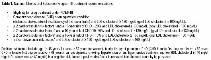 Assessment of cardiovascular risk attributable to lipoprotein abnormalities is a controversial issue. Several parameters, cutoff points and algorithms have been used.13 In 2001, a new version of the recommendations of the Expert Panel on Detection, Evaluation and Treatment of the National Cholesterol Education Program (NCEP III) was published.4 This report introduces the concept of "equivalents of coronary heart disease" for conditions with similar event rates for cardiovascular mortality. It also includes a revised Framingham risk equation5 for the estimation of the absolute cardiovascular risk. Finally, the lowdensity cholesterol (LDLC) is considered the most important lipid parameter; the treatment eligibility LDLC thresholds were lowered in some subsets of the population. The impact of this report was assessed in the Third Annual National Health and Nutrition Survey (NHANES III).6 Here, patients younger than age 45 or older than age 65, especially males, were more likely to require treatment. The NCEP III recommendations are now routinely used in a number of countries. However, the lipid profile abnormalities differ between ethnic groups.7 The mean LDLC concentrations are significantly lower in Hispanic or Asian groups.8,9 These subjects will require a greater number of cardiovascular risk factors in order to be eligible for treatment. As a consequence, the impact of the NCEPIII recommendations should also be assessed in nonCaucasian populations.