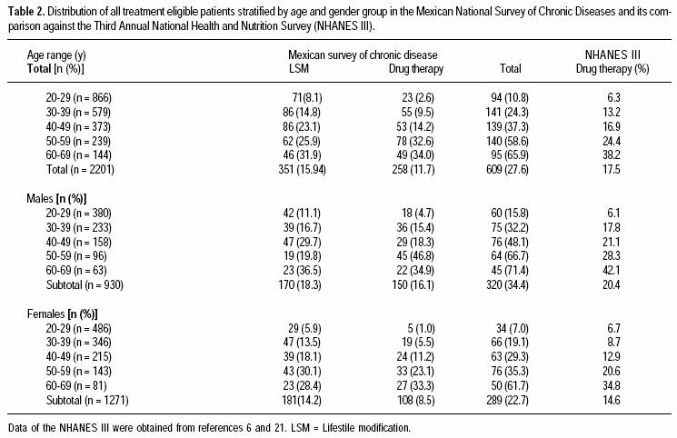 Between 19921993, the Mexican Ministry of Health conducted the National Survey of Chronic Diseases to estimate the prevalence of obesity, type 2 diabetes, renal pathology, hypertension and dyslipidemia. Using this populationbased, nationwide data, we describe the number and the characteristics of urban Mexican adults who are eligible for treatment using the NCEPIII recommendations.