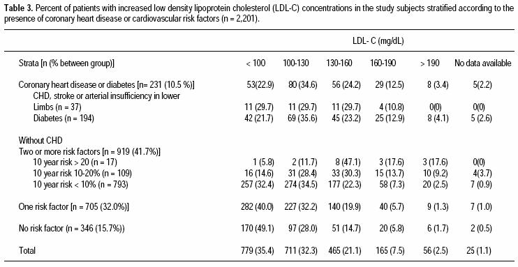 Their implementation is supported by prospective data derived mainly from Caucasian groups. However, these criteria are widely used in nonCaucasian populations, despite the fact that these populations have a differing prevalence of several types of dyslipidemia. Thus, the ability to identify and treat patients with increased cardiovascular risk must be measured in populationbased studies of nonCaucasian subjects. In this survey, representative of urban Mexican adults aged 20 to 69 years, a coronary heart disease equivalent was found in 10.5% and two or more risk factors were detected in an additional 41.7%. Nearly a quarter of the study population qualified for some form of lipid lowering therapy: LDLC lowering drug treatment was recommended for 11.7%. Our data helps to estimate the magnitude of the burden imposed on the Mexican health system of lowering LDLC for cardiovascular prevention. Applying our results to the 2000 Mexican population census19 (considering only the segment of the population covered by our survey), more than 5.8 million cases nationwide may require LDL lowering drug therapy following the NCEPIII criteria.