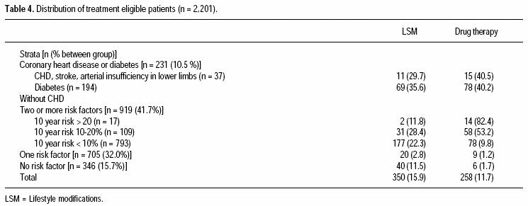 The NCEP III guidelines were applied to each subject. According to the NCEP III recommendations, patients with no coronary heart disease (CHD) or equivalent are considered elegible for treatment if they have < 1 CHD risk factors and LDLC > 190 mg/dL or > 2 CHD risk factors and LDL > 160 mg/ dL. For CHD patients or equivalent, treatment is considered neccesary if the LDLC > 130 mg/dL. Positive risk factors for CHD include age (> 45 years for men or > 55 for women), family history of CHD, current cigarrette smoking, hypertension (blood pressure > 140/90 mmHg or on antihypertensive medication) and low HDLC (< 40 mg/dL). An HDLC > 60 mg/dL is considered a negative risk factor, allowing the removal of one point from the sum of risk factors. The selection criteria for treatment according to the NCEP III recommendations are shown in table I. The 10year absolute risk was calculated with sex and agespecific Framingham score sheets. The number of cases requiring lifestyle changes or drug therapy was calculated accordingly.