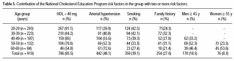 The group with two or more risk factors deserves special attention. The distribution of the NCEP risk factors by age group is shown in table 5. The most frequent risk factor was a low HDL cholesterol concentration; it was present in 786 (85.5%) of the 919 subjects of this group. The coexistence of smoking was the most common combination among young adults (< 40 years). In contrast, the coexistence of arterial hypertension was the most frequent finding in cases older than age 40. The use of the Framingham tables is limited to the group with two or more risk factors. Based on the risk score evaluation, the LDLC goal is selected. A small percentage (1.8%) was identified as highrisk (10 year risk > 20%); almost every case in this group qualified for drug therapy. In contrast, 86.3% of the cases with 2 or more risk factors were identified as low risk individuals (10 year risk < 10%); only a few (9.8%) qualified for drug therapy. Thus, the use of the Framingham tables has a large impact on the proportion of cases with 2 or more risk factors that qualify for drug therapy.
