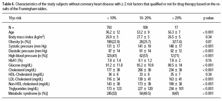 The validation of the Framingham tables has been done mainly in Caucasian subjects. Since the use of this instrument has a remarkable impact on the selection of cases that qualify for drug treatment, we evaluated the differences between subjects stratified into the three categories of the Framingham tables. As shown in table 6, cases with the highest risk (a 10 year risk > 20%) were the oldest, had the highest prevalence of high blood pressure and the highest levels of LDLC and nonHDL cholesterol. However, the cases with lower risk (10 year risk < 10%) had a similar prevalence of obesity and their mean HDLC concentration was no different from that found in the highrisk subjects. Thus, the prevalence of some conditions (e.g. several components the metabolic syndrome) not taken into account by the Framingham tables (i.e. obesity) is similar among cases identified as high or low risk.