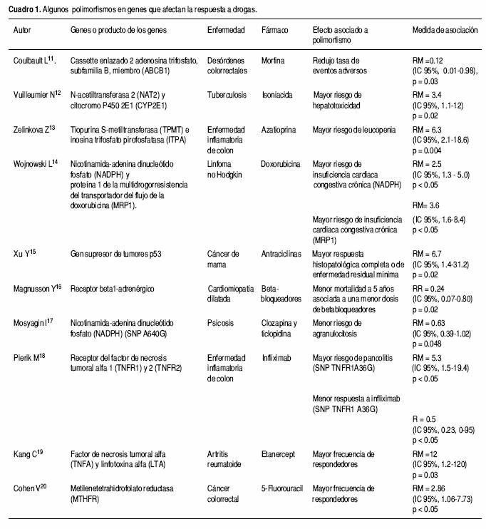 La farmacogenómica se ha mostrado útil en diferentes aplicaciones clínicas. Al investigar la influencia de factores genéticos y no genéticos en los requerimientos de dosis de morfina y sus eventos adversos después de cirugía colorrectal, se ha podido dar tratamiento más individualizado a pacientes con alteraciones colorrectales.11 La determinación de la genotificación de NAT2 y citocromo P450, ha permitido identificar polimorfismos genéticos en humanos asociados a la hepatotoxicidad por isoniacida en pacientes con tuberculosis pulmonar, por lo cual la evaluación de los polimorfismos podrá hacerse en el futuro antes de iniciar el tratamiento.12 La determinación de la contribución de mutaciones en ITPA TPMT en el desarrollo de toxicidad inducida por azatioprina en pacientes con enfermedad inflamatoria de colon tiene un objetivo similar.13 La cardiotoxicidad ha sido siempre un evento adverso que limita la administración de doxorrubicina en el tratamiento del cáncer, por lo que el haber demostrado una asociación entre los polimorfismos en la oxidasa NAD(P)H y la proteína MRP1 y la cardiotoxicidad de la droga permitirá una mejor selección de pacientes que puedan verse beneficiados por este fármaco.14
