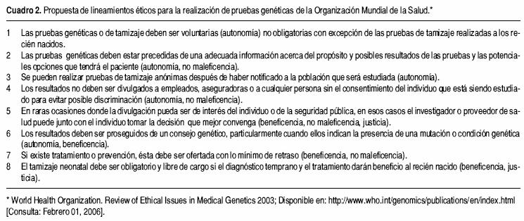 58. World Health Organization. Review of Ethical Issues in Medical Genetics 2003; Disponible en: http://www.who.int/genomics/publications/en/index.html (Consulta: Febrero 01, 2006) [ Links ]