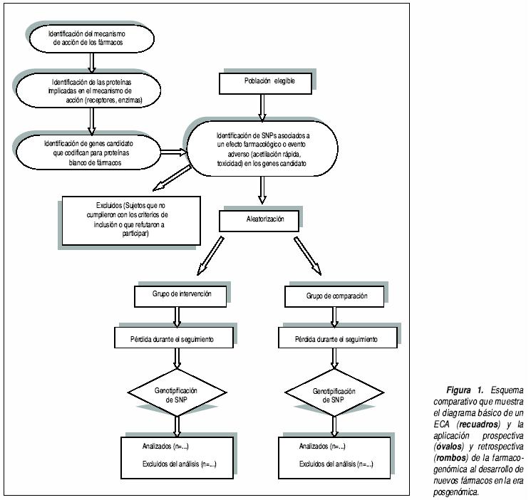 En años recientes el análisis de variabilidad genómica se ha ido incorporando en los ECAs ya sea prospectiva30 o retrospectivamente.31,32 El estudio prospectivo de los polimorfismos se refiere a que antes de la aleatorización en el ensayo clínico se hace la genotipificación de la población elegible y tiene como objetivo el reducir tanto las alteraciones en la biodisponibilidad de la droga terapéutica como la incidencia de EAS que pudieran estar asociadas a la presencia de polimorfismos.33 La genotipificación prospectiva funciona habitualmente como un criterio de exclusión antes del reclutamiento de los pacientes en el estudio.34 El uso retrospectivo de la genotipificación en los ensayos clínicos se refiere a clasificar a los sujetos de acuerdo con su genotipo una vez que se ha evaluado el tratamiento, de que se ha hecho el seguimiento y de que se ha considerado la pérdida de pacientes durante el seguimiento. Una vez clasificados los pacientes de acuerdo con su genotipo, se hace el análisis estadístico del estudio para evaluar la eficacia de los tratamientos de acuerdo con el genotipo encontrado. Tanto la evaluación prospectiva y retrospectiva del genotipo en humanos incrementa la eficiencia estadística del estudio.